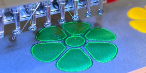 Close-up of a computerized embroidery machine stitching a company logo on an FR coverall.