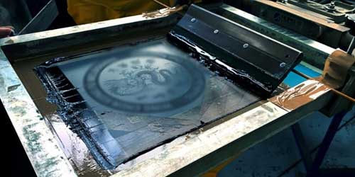 Technician applying reflective tape under a heat-press machine.